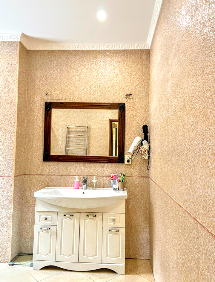 Площадь дома — 900 м², есть бассейн, финская сауна, хаммам, джакузи. Большая территория — 25 соток, озеро с карпами.